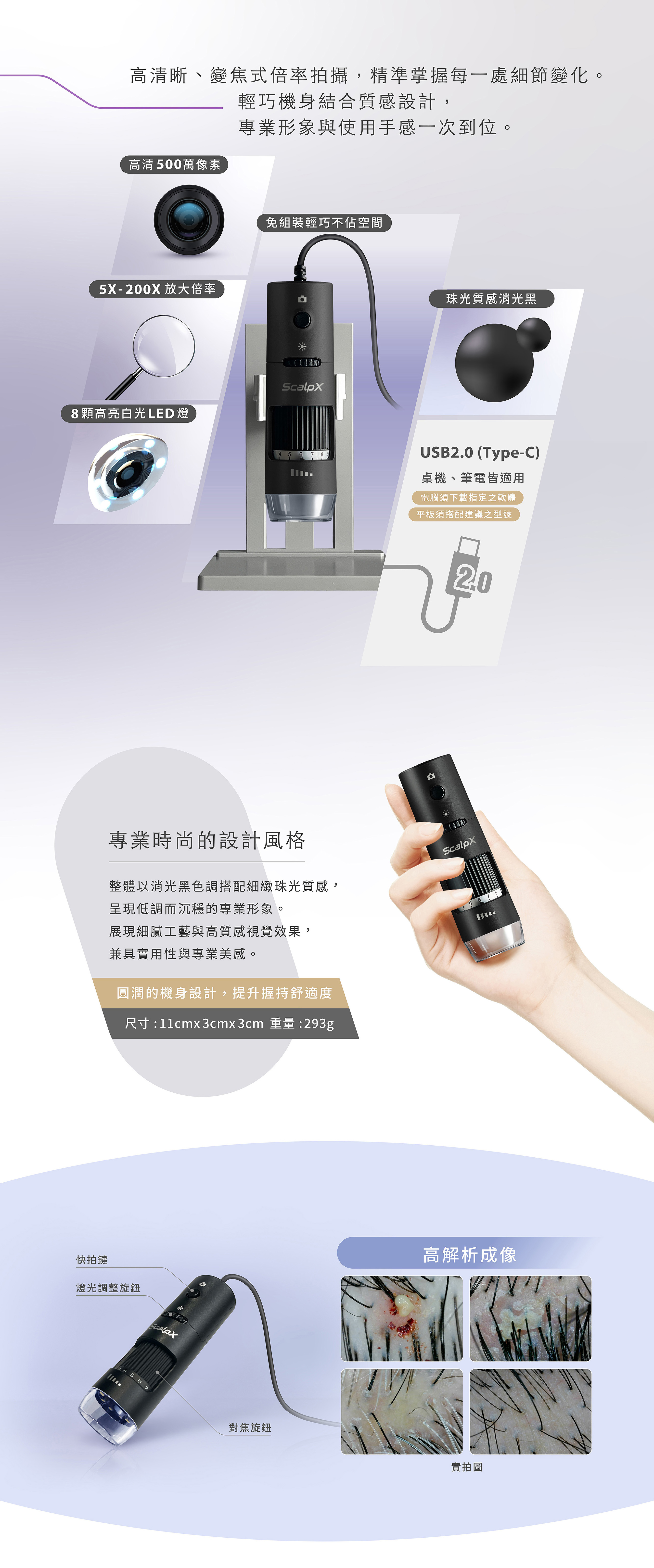 產品功能:500萬畫素鏡頭、5X-200X高低倍率變焦與LED可調光源、採用OTG轉接方式至平版或手機使用