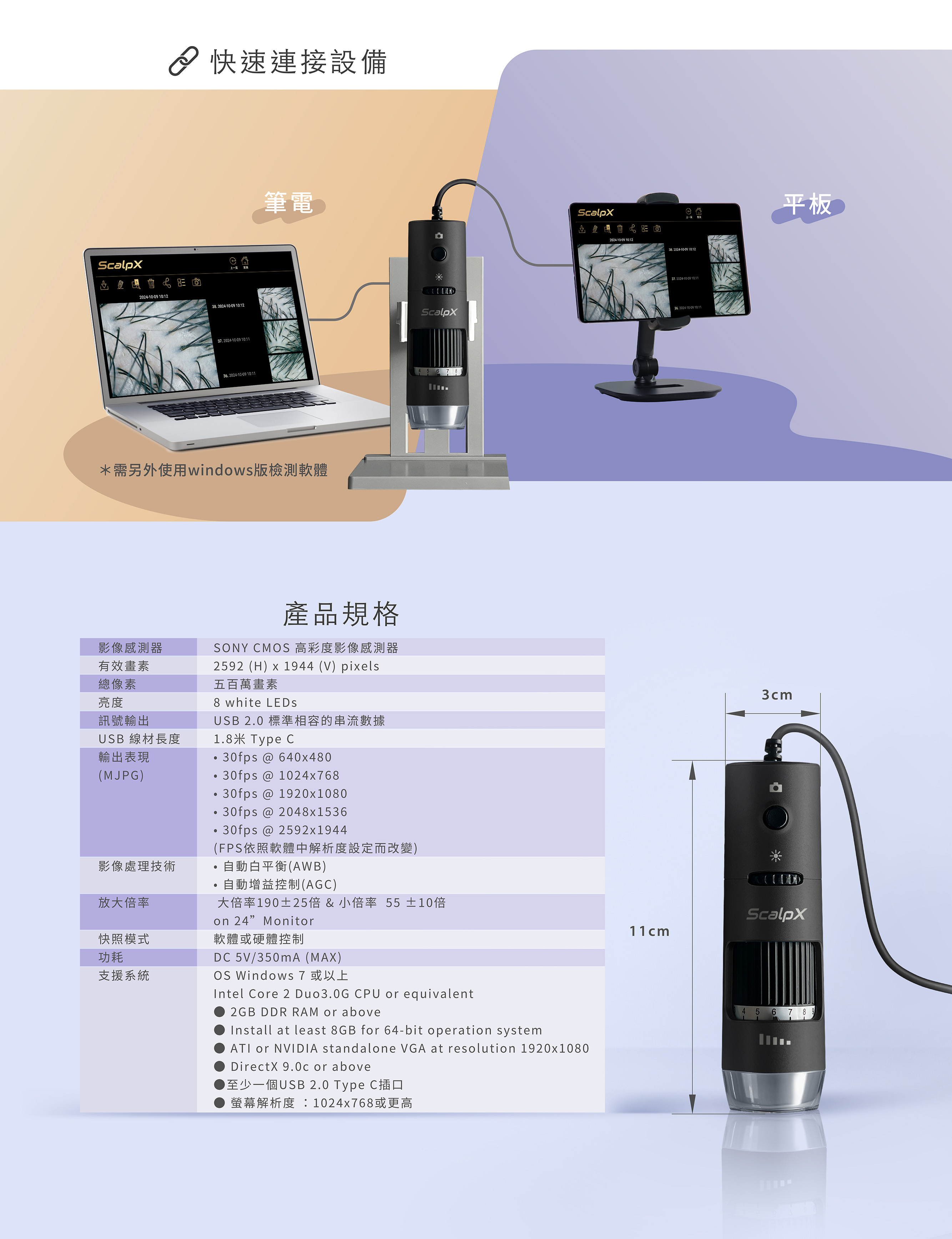 產品功能:500萬畫素鏡頭、5X-200X高低倍率變焦與LED可調光源、採用OTG轉接方式至平版或手機使用